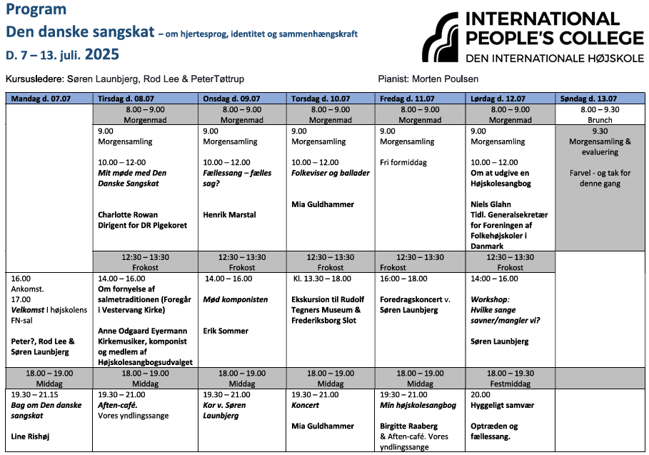 Den danske sangskat program til ugekursus på Den Internationale Højskole